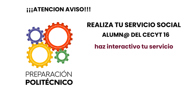 Aviso Importante La inscripción y asistencia al “Curso de Preparación para Examen de Admisión al Nivel Medio”, NO GARANTIZA obtener un lugar en el CECyT 16, ni en otras instituciones de nivel medio superior. El ingreso al Instituto Politécnico Nacional (IPN) es a través del examen de admisión que se realiza de forma anual, proceso que dirige y coordina la Dirección de Administración Escolar (DAE) del IPN. Lo único que puede garantizar tu lugar en el CECyT 16 del Instituto Politécnico Nacional, es el excelente desempeño en tu examen. Prepárate, estudia y aplica tus conocimientos adquiridos.